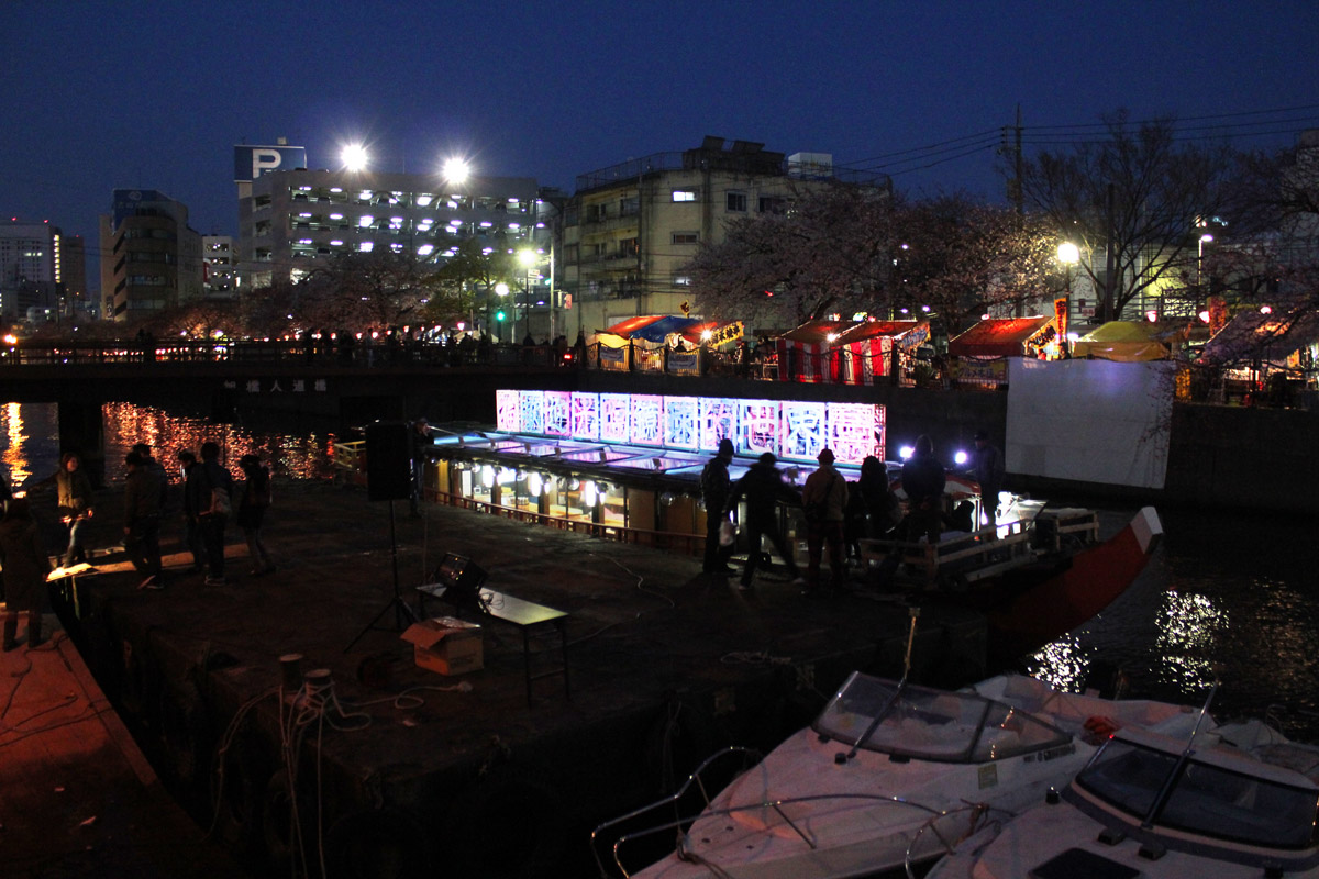 屋形船は、この場所にて長年屋形船営業を続けている正義丸で、この日は通常営業と異なり、大人1名2,000円で30分程度のクルーズを楽しめる趣向でした。お酒は持ち込んでもいいし、船内で買うこともできますが、食事はできません。但し軽食等の持ち込みは可能なようです。運行は4回行われました。当日、地域の商店会などもイベントを行なっていて、船着場では映画上映や白井貴子のミニライブも行われていましたが、ミラーボウラーの活動は、そうした地元主催のイベントと直接関連はないそうです。