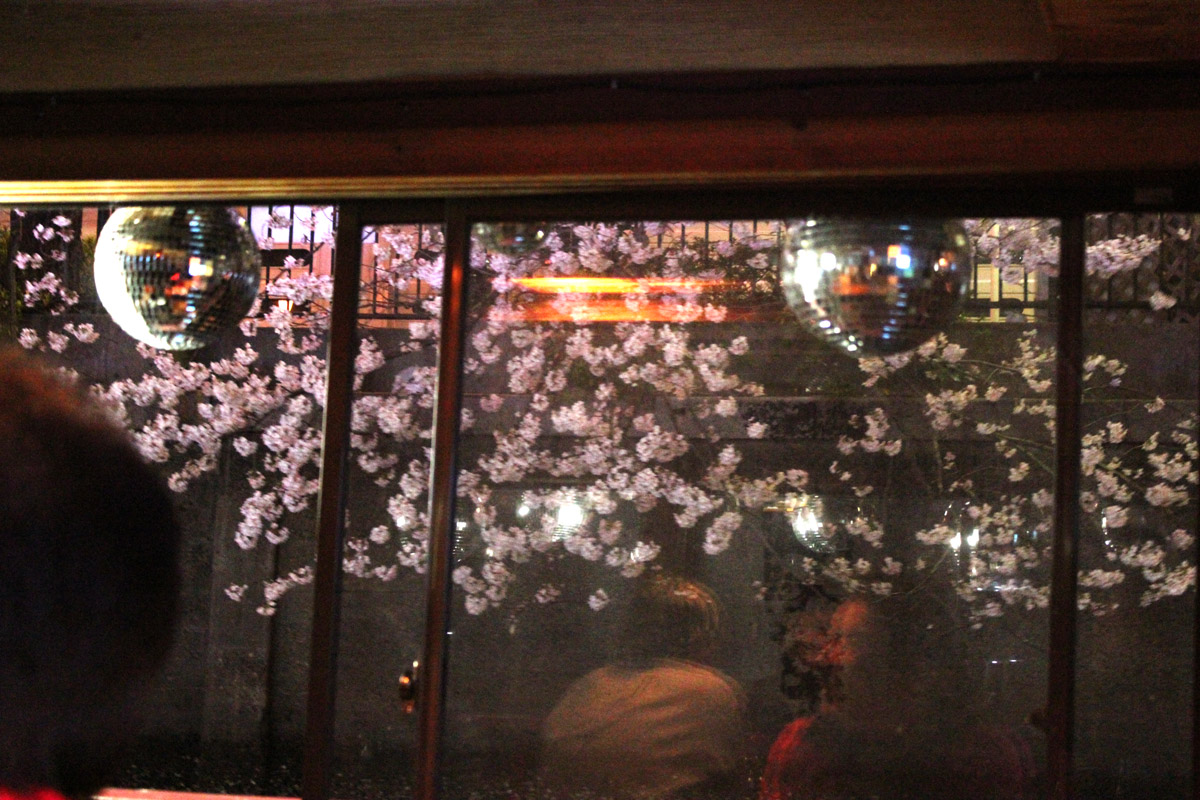 写真では分かりにくいかも知れませんが、屋根上に取り付けられた文字の造形物の中にミラーボールが仕込まれ、光をキラキラと反射させています。また、客室の窓部分もたくさんのミラーボールが取り付けられ、沿岸の桜に光を反射させています。