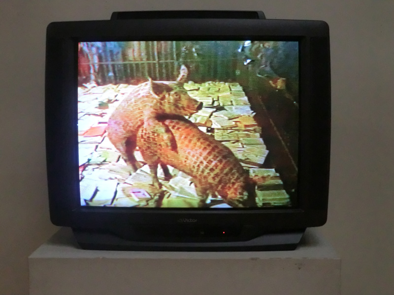 中国のXu Bingという作家のインスタレーションを撮影したビデオ作品。オス豚には意味不明の英文らしき文字。メス豚には漢字が。まるで耳なし芳一ですね。猛烈な勢いで強◯しまくります。