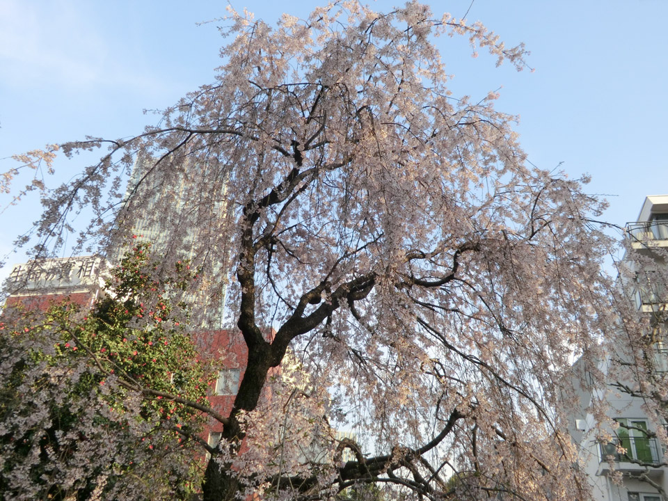 乃木神社入り口の鳥居横の枝垂れ桜。散り始めながらまだまだ70%くらい花は残っていました。
